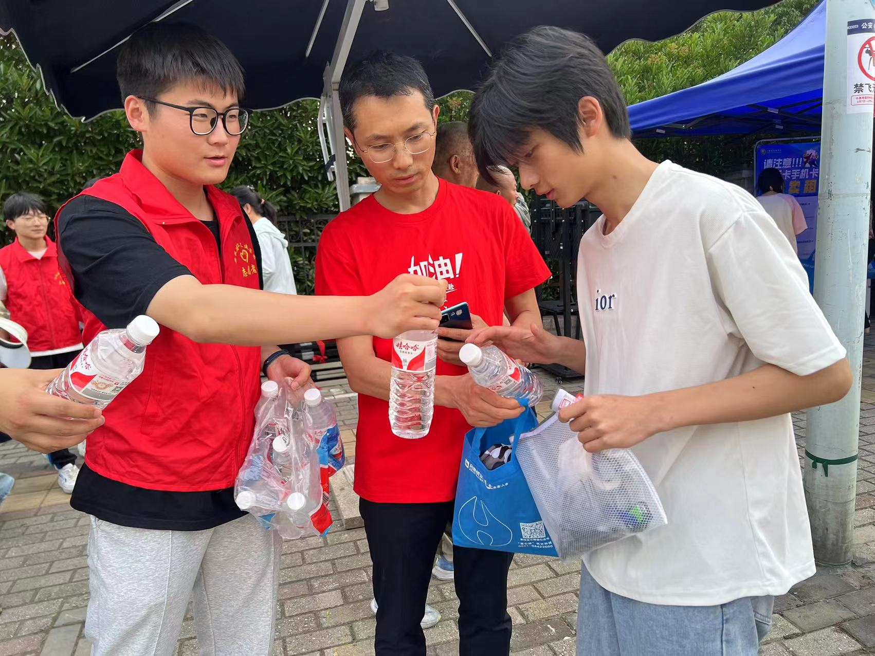 装饰公司团支部组织青年志愿者为高考生们送去矿泉水和励志祝福语,缓解紧张气氛。